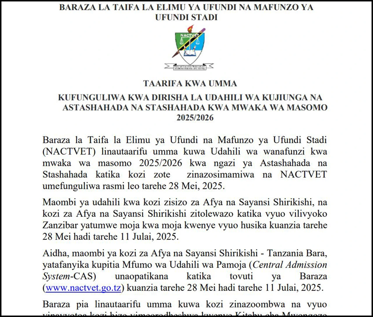 Tahadhari kwa Waombaji Wa Vyuo 2025/2026